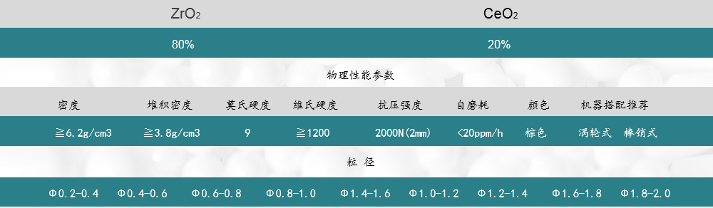 由氧化鈰穩(wěn)定,經(jīng)過(guò)滴定,燒結(jié)定相而成,珠子的微觀結(jié)構(gòu)致密,密度大,研磨動(dòng)能大,耐磨性好,非常適合高固相,高硬度,高粘度難分散的物料。